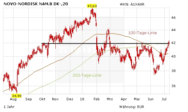 Im Jahr 2015 hat die Aktie von Novo Nordisk bei exakt 415 Dänischen Kronen das bisherige Rekordhoch markiert. Heute notiert das Papier bei 313 Kronen deutlich unter den Höchstständen. Zwischenzeitlich hatten die Dänen dem immensen Preisdruck auf dem Insulin-Markt Tribut zollen müssen. Die Folge: Mehrere Prognosesenkungen. Doch das ist Schnee von gestern. Novo Nordisk hat längst wieder den Weg nach oben eingeschlagen und überzeugt auch wieder die Analysten.