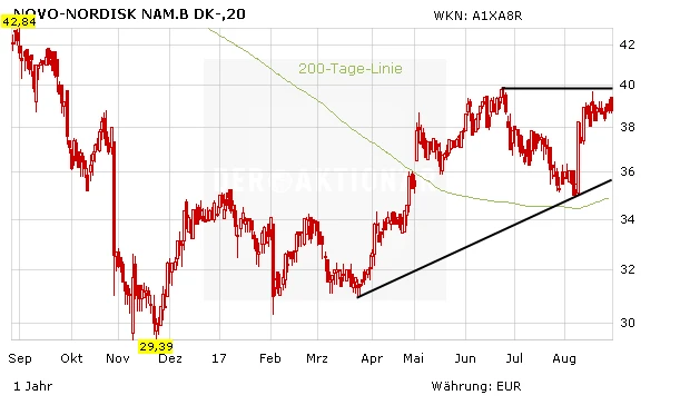 Der Insulinhersteller Novo Nordisk kann einmal mehr mit positiven Neuigkeiten aufwarten: Victoza wurde von der amerikanischen Zulassungsbehörde FDA für eine weitere Indikation zugelassen. Damit winken den Dänen weitere Umsatzerlöse. Die Aktie nimmt derweil wieder Kurs in Richtung des Jahreshochs bei 296,80 Kronen.