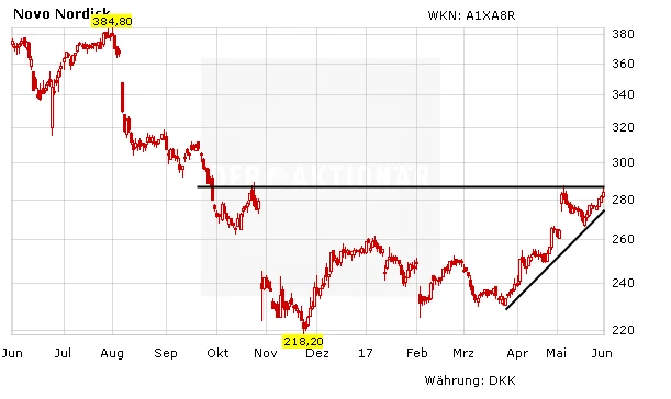 Die Konsolidierung nach den starken Quartalszahlen ist beendet – die Novo-Nordisk-Aktie nimmt wieder Kurs in Richtung Jahreshoch bei 287,70 dänischen Kronen (rund 38,70 Euro). Aktuell notiert das Papier nur noch rund ein Prozent unter dieser charttechnischen Hürde. Gelingt der Ausbruch sind Kurse von über 40 Euro nur eine Frage der Zeit. Investierte Anleger bleiben an Bord – spekulative Neueinsteiger können weiter zugreifen.