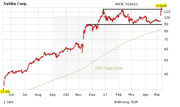 Im ersten Quartal hatte Nvidia die Schätzungen der Experten wieder einmal deutlich übertroffen. Vor allem das Datacenter-Segment, die Gaming-Grafikkarten und die Tegra-Chips für die Nintendo Switch liefen gut. Das zeigt: Die Nachfrage nach den Zukunftstechnologien von Nvidia ist ungebrochen hoch und dürfte sogar noch weiter anziehen. Mittlerweile hat auch RBC-Analyst Mitch Stevens reagiert. Er hob das Kursziel von 138 auf 150 Dollar und bestätigte das Votum auf „Outperform“.