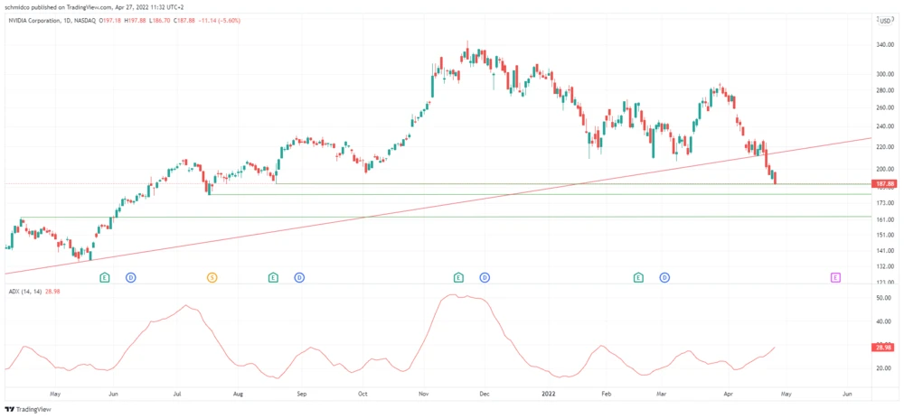 Um die Trendstärke zu messen, kann der ADX-Indikator zu Hilfe genommen werden. Seine Interpretation: Bei Indikatoren-Werten über 25 liegt ein Trend vor, ab einem Wert von 30 gilt er als stark. Für die Nvidia-Aktie liegt der Wert mittlerweile bei 29, Tendenz steigend. Der Abwärtstrend nimmt also an Fahrt auf.