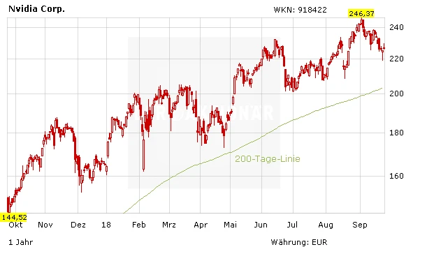 Investierte Anleger bleiben dabei. Das Gaming-Geschäft ist im Aufschwung und die Nvidia-Aktie macht trotz starker Konkurrenz, wie zum Beispiel die AMD, gute Gewinne. Mit dem äußerst bullishen Analysten-Zielkurs von 340 Dollar besteht beim aktuellen Kurs von etwa 267 Dollar gut 27 Prozent Potenzial. Das Kursziel des AKTIONÄR liegt dagegen bei 275 Euro.