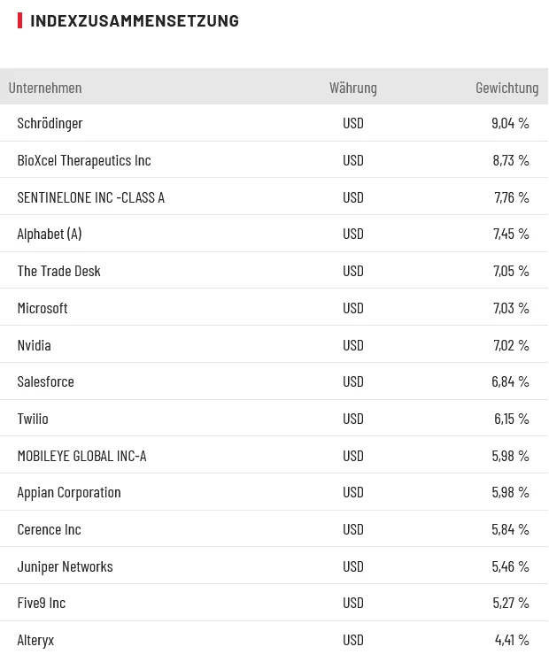 Im Index befinden sich neben den großen Playern wie Microsoft, Alphabet und Nvidia auch etwas kleinere Unternehmen. Das sind unter anderem die amerikanischen Konzerne Schrödinger und BioXcel, die ihre KI-Technologien im Gesundheitsbereich und bei der Medikamentenforschung einsetzen.