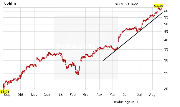 Das Wachstumspotenzial von Nvidia verdeutlicht auch das Chartbild der Aktie. Der Kurs hat sich im Jahresvergleich vervierfacht. Mit einem KGV von 38 ist die Aktie dafür aber auch relativ teuer. Nach einer leichten Konsolidierung nähert sich die Aktie diese Woche wieder ihrem Allzeithoch bei 63,04 Dollar an. Anleger können in Schwächephasen eine kleine Position aufbauen.