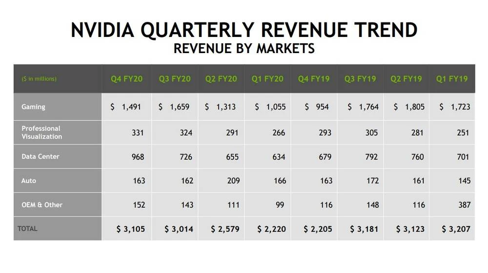 In den Zukunftsbereichen Cloud- und KI-Anwendungen holt unter anderem der Konkurrent Intel durch Zukäufe immer mehr auf. Nvidia-CEO Jensen Huang sieht den Halbleiterspezialisten durch neue Anwendungen weiterhin für die Trendthemen 5G, Robotik und autonomes Fahren gut gerüstet.