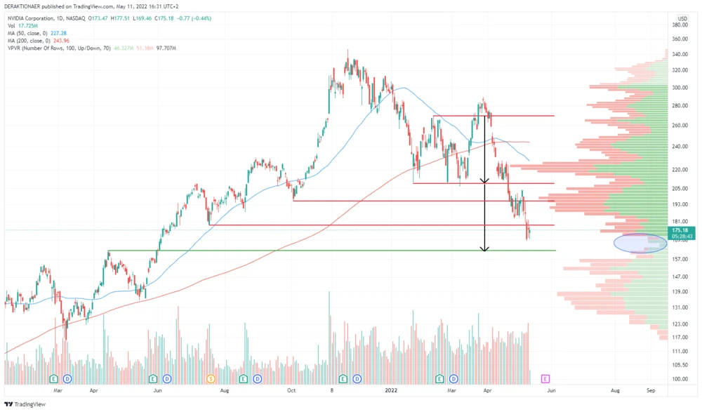 Bei der Nvidia-Aktie zeichnet sich weiterhin noch keine Bodenbildung ab. Bei Kursen unter 170 Dollar wären sogar weitere Kursrutscher bis 162 Dollar wahrscheinlich. Erst wenn sich der Titel in den Bereich um 190 Dollar zurückkämpfen kann, wird der Wert wieder interessant. In allen Fällen sollten Neueinsteiger aber erst die Zahlen am 25. Mai abwarten.
