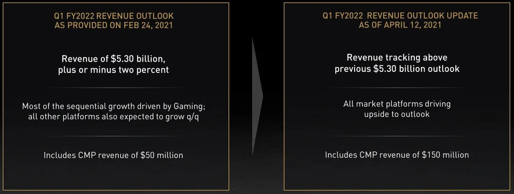 Denn Nvidia kündigte auf dem jährlichen Investorentag an, dass der Umsatz im ersten Geschäftsquartal 2022 (bis Ende April 2021) über der zuvor gegebenen Prognose (5,3 Milliarden Dollar +/- zwei Prozent) liegen dürfte.