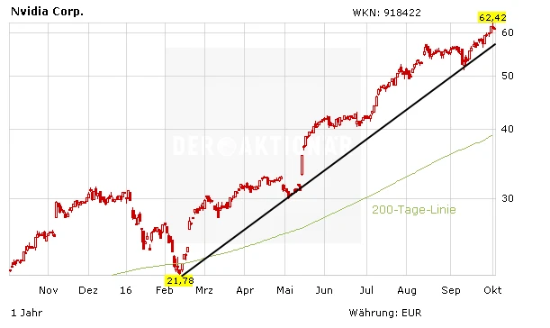 Nvidia gestaltet die Zukunft der Industrie 4.0 maßgeblich mit. Bis andere Chiphersteller eigene Lösungen anbieten, bleibt Nvidia unbehelligt der Marktführer im Bereich des Deep Learnings. Mit einem 17er KGV von 30 ist die Aktie zwar teuer, bietet mit den Themen „Gaming“ und „Autonomes Fahren“ aber überzeugende Kursfantasien. DER AKTIONÄR empfiehlt die Gewinne entlang des Aufwärtstrends laufen zu lassen.