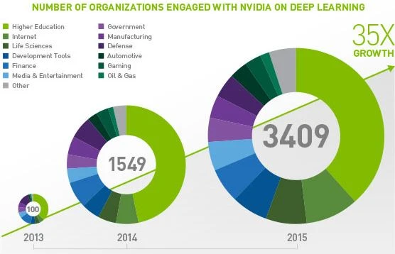 Der Grafikkartenhersteller Nvidia ist beim Deep Learning unschlagbar. Kein Wunder, denn die Grafikprozessoren eignen sich bestens zur parallelen Berechnung von sich wiederholenden Algorithmen. Maschinelles „Deep Learning“ ermöglicht Computern zu sehen, zu lernen und auf komplexe Situationen zu reagieren. Genutzt werden kann diese Technologie in jeder Branche, die mit größeren Datensätzen arbeitet.