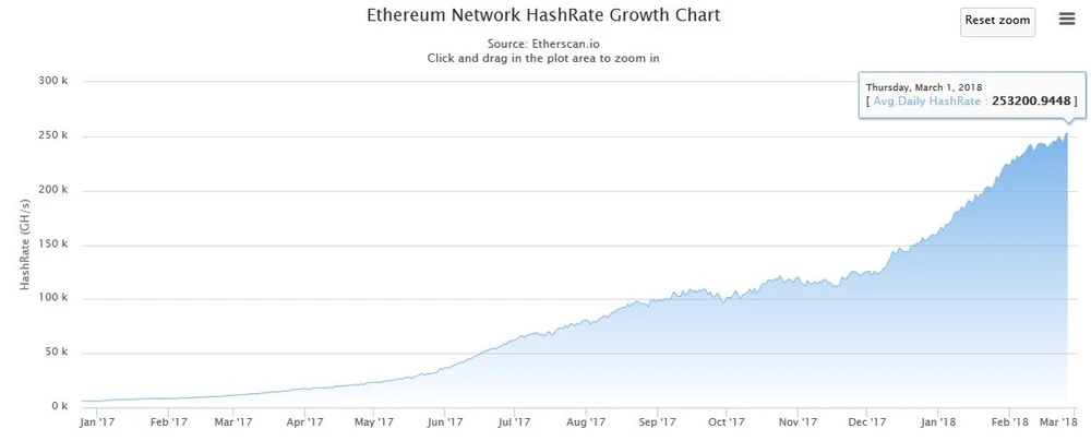 Die durch steigende Krypto-Preise ausgelöste Situation hält auch im ersten Quartal an. So wurden dem Ethereum-Netzwerk seit Jahresanfang rund 96.000 GH/s (Gigahash pro Sekunde = die Anzahl der Berechnungen im Krypto-Algorithmus pro Sekunde) an Rechenpower hinzugefügt. Bei einer durchschnittlichen Hashrate pro Grafikkarte von 24 MH/s sind das vier Millionen Grafikkarten, die zusätzlich im Ethereum-Netzwerk rechnen. Zum Vergleich: Im gesamten Jahr 2017 wurden 151.000 GH/s hinzugefügt.