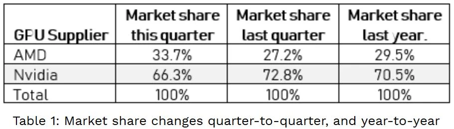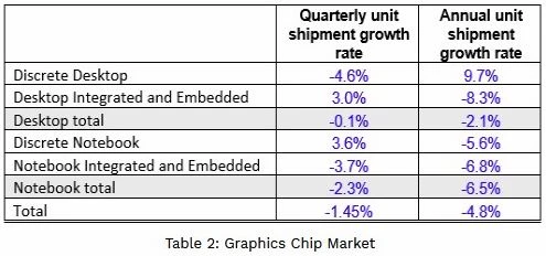 Laut Zahlen von Jon Peddie Research schrumpfte der gesamte Grafikchip-Markt zwar im vergangenen Jahr um 4,8 Prozent. Dies war insbesondere auf die schwächeren Notebook- und PC-Verkäufe zurückzuführen – Zahlen die AMD und Nvidia kaum tangieren.