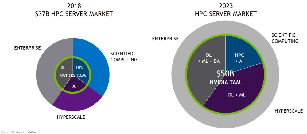 Zum zweiten wird die Performance im Bereich Data-Center wichtig. Nvidia wuchs hier im vergangenen Jahr um 52 Prozent – konnte aber die Erwartungen im vierten Quartal nicht erfüllen. Die Kunden stellten in einem unsicheren Marktumfeld die Investitionen zurück. Der adressierbare Markt soll in der Zukunft jedoch rasant weiterwachsen und umfasst beispielsweise High-Performance-Computing für die Wissenschaft oder Prozessoren für Cloud-Anbieter wie Google.