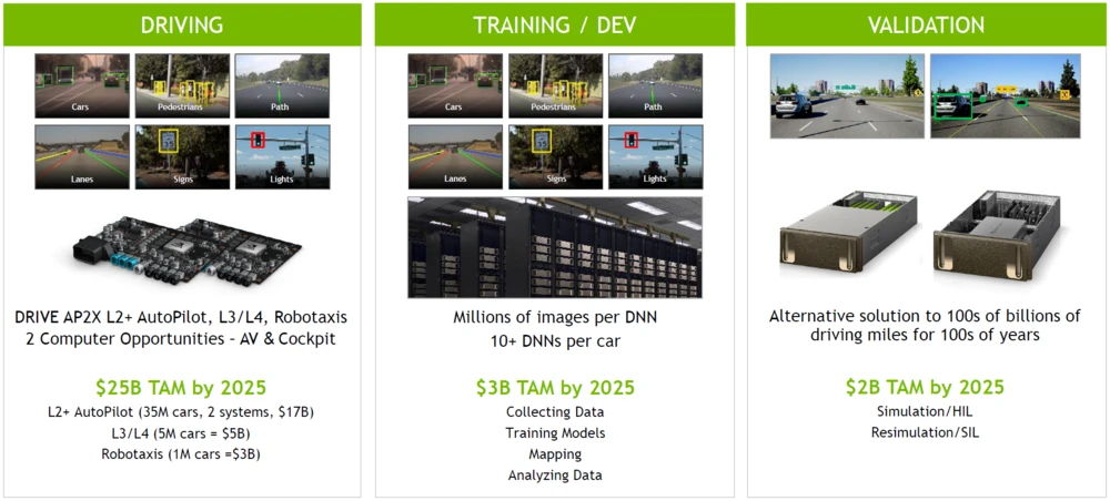 Das dritte wichtige Geschäftsfeld für Nvidia liegt im Bereich des Autonomen Fahrens. Der Plan ist, gemeinsam mit einem ständig wachsenden Ökosystem von Partnern aus der Automobilindustrie eine Plattform für die Zukunftstechnologie anzubieten. Nvidias Prozessoren liefern hier nicht nur die nötige Rechenpower in den Fahrzeugen, sondern helfen beim Training der KI oder beim Erstellen von Karten.