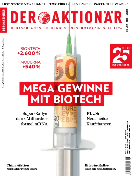 Außerdem im neuen Heft: Nach der zuletzt phänomenalen Rallye der mRNA-Impfstoff-Aktien und einem zwischenzeitlichen Gewinn von plus 3.000 Prozent seit Erstempfehlung des AKTIONÄR stellen sich Anleger nun die Frage: Haben die Aktien von BioNTech, Moderna und Co den Renditegipfel überschritten oder stehen weitere Durchbrüche mit erneutem Milliardenpotenzial schon in den Startlöchern? DER AKTIONÄR verrät Ihnen die neuen heißen Kaufchancen.
