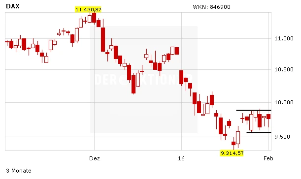 Ein Stand von 9.500 Zählern heißt auch, dass die jüngste Seitwärtsrange zwischen 9.900 und 9.563 Punkten nach unten verlassen wurde. Neben der psychologisch wichtigen Marke von 9.500 wartet bei 9.470 Punkten eine weitere - wenn auch wenig tragfähige - Unterstützung. Viel wichtiger ist, dass das Verlaufstief bei 9.314 Zählern nicht unterschritten wird. Denn sonst dürfte sich der Abwärtstrend noch einmal beschleunigen.