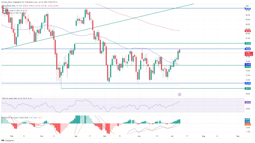 Die Ölpreise sind zwischen bullishen und bearishen News gefangen. Einerseits verringern die Opec-Staaten durch Förderungskürzungen das Angebot. Doch andererseits deuten die schwachen Daten aus China auf eine schwächere Konjunktur und damit geringere Nachfrage hin. Erst ein Ausbruch über die 80-Dollar-Marke beziehungsweise unter die 70-Dollar-Marke würde die Seitwärtsphase beenden.