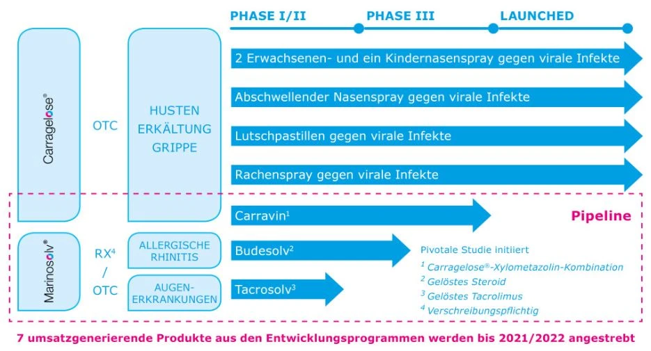 Marinomed verfügt über zwei Technologieplattformen: Carragelose und Marinosolv. Die Plattform Carragelose umfasst patentgeschützte Produkte zur Behandlung von viralen Infektionen der Atemwege. Carragelose kommt in Nasensprays, Rachensprays und Pastillen zur Anwendung, die mit internationalen Partnern weltweit in mehr als 30 Ländern vertrieben werden. Eine Serie weiterer Produkte befindet sich im Entwicklungsstadium. Grassauer erklärt: „Einzigartig dabei ist, dass die Ursache der Erkrankung, nämlich die Viren, bekämpft wird und nicht nur die Symptome.“