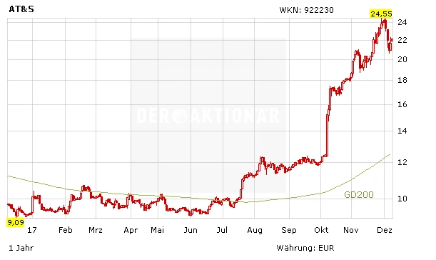 Auf Platz 1 rangiert die Aktie von AT&S. Das Unternehmen produziert dünne, hochkomplexe Leiterplatten. Diese sind die Schnittstelle zwischen elektronischen Endgeräten und mechanischen oder elektronischen Bauteilen wie Halbleitern. Sie werden in Smartphones, Notebooks, in der Industrieelektronik, im Bereich Automotive sowie in der Medizin- und Gesundheitstechnik eingesetzt.