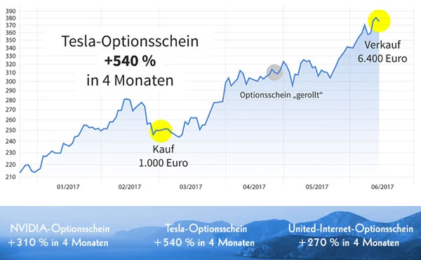 - 6 Monate lang: dynamisches „Durchrollen“ der Optionsscheine. Um die Rendite zu steigern, verkaufen wir bei Trendbruch einen Optionsschein und kaufen einen neuen, frischen Optionsschein auf eine Aktie mit intaktem Trend.