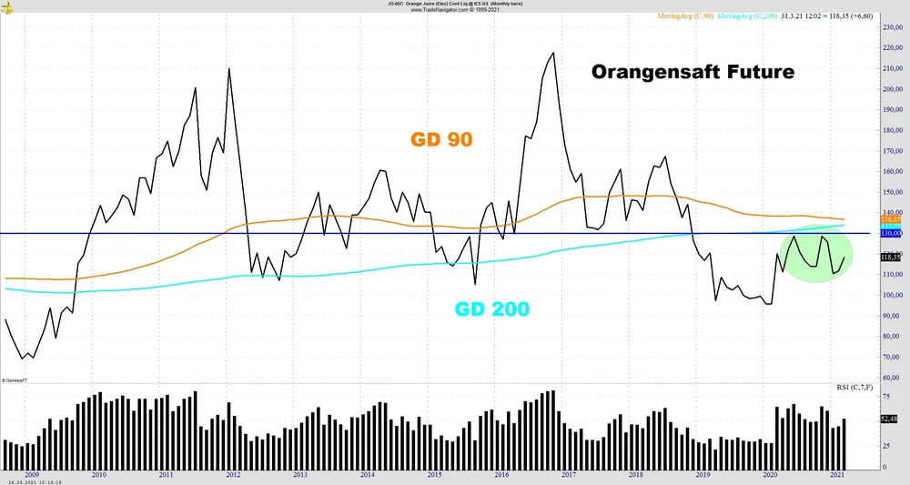 Orangensaft zählt zu den volatilsten Instrumenten im Bereich Rohstoffe und gehört zu den „gute Laune“ Produkten. Der Anleger benötigt starke Nerven, denn mehrere Hundert Prozent Schwankungen in wenigen Monaten sind in diesem mittlerweile auch relativ illiquiden Rohstoff nicht ungewöhnlich. Aktuell nähert sich der Future der 130 Cent-Marke, sollte er diese durchbrechen könnte es einen weiteren Schub nach oben gehen.