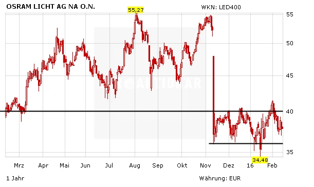 Im turbulenten Gesamtmarkt hat sich die Osram-Aktie zuletzt relativ stabil präsentiert. Die starken Zahlen haben zudem gezeigt, dass die neue Strategie erste Früchte trägt. Anleger sollten vor einem Einstieg aber abwarten, ob die 40-Euro-Marke nachhaltig überwunden werden kann. Sobald sich das Marktumfeld aufhellt, dürfte diese Hürde attackiert werden.