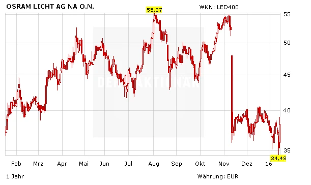Nach dem Spartenverkauf wird Osram künftig nur noch aus drei Säulen bestehen: Auto- und Spezialbeleuchtung, optische Halbleiter und Lichtmanagement-Systeme. Allerdings sind die kostspieligen Umbaupläne zunächst auf wenig Gegenliebe gestoßen – seit der Bekanntgabe im vergangenen November hat die Aktie zwischenzeitlich ein Drittel an Wert verloren.