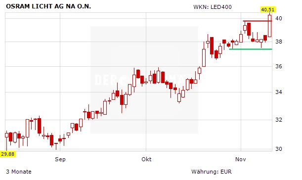 Die Osram-Aktie klettert heute auf den höchsten Stand seit dem Handelsdebüt im Juli dieses Jahres. Zuvor veröffentlichte der Lichttechnik-Spezialist starke Zahlen für das vierte Quartal und überzeugte darüber hinaus mit einem optimistischen Ausblick. Der ehemaligen Siemenstochter gelang im abgelaufenen Geschäftsjahr die Rückkehr in die schwarzen Zahlen. Unter dem Strich blieb ein Gewinn von 34 Millionen Euro, nach einem Verlust von 391 Millionen Euro im Jahr zuvor, hängen. Details zu den Zahlen finden Sie hier.