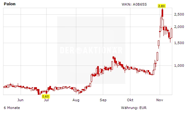 War der Biotech-Überflieger gestern im Tief noch für 1,50 Euro zu haben, so kratzt er heute schon wieder an der 2-Euro-Marke. Der AKTIONÄR hält an seinem in der brandneuen Ausgabe gesetzten Erst-Kursziel von sechs Euro fest. In den nächsten Tagen und Wochen könnte Paion schnell bis in den Bereich des erst vor wenigen Tagen markierten Jahreshochs (dieses lag bei 2,88 Euro) vorstoßen. Viele unbekannte Hintergründe zu Paion sind im neuen Paion-Spezialreport des AKTIONÄR „140%-Chance im Biotech-Sektor: Jetzt schnell zugreifen“ zu finden, den Sie hier herunterladen können.