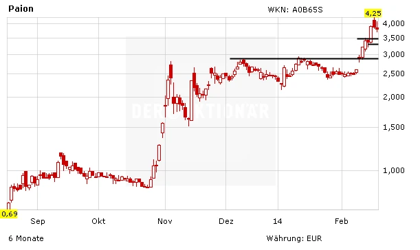 Nachdem die Aktie von Paion in den vergangenen Tagen nahezu nur eine Richtung kannte – die nach oben – legt das Papier am Mittwoch eine Verschnaufpause ein. Am Mittwochnachmittag verliert Paion 2,6 Prozent auf 3,78 Euro. Am Dienstag hatte die Aktie noch kurzzeitig die 4-Euro-Marke überwunden und bei 4,25 Euro ein neues Zwischenhoch markiert.