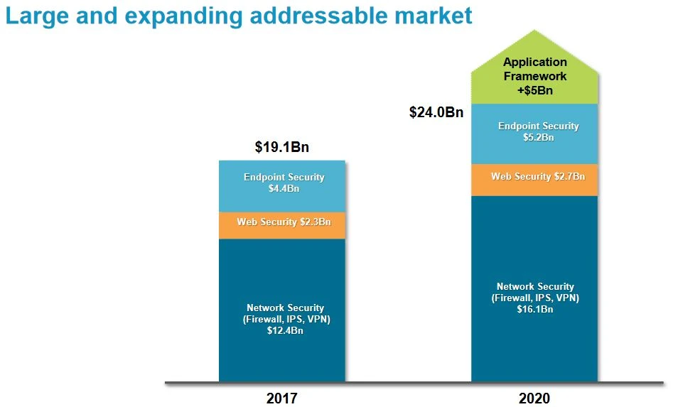 In der Cloud eröffnen sich neue Chancen. Denn der Cloud-Security-Markt dürfte mit einem jährlichen Durchschnittswachstum von 14 Prozent zwischen 2017 und 2022 schneller wachsen als der Gesamtmarkt. Die Diversifizierung des Kerngeschäfts rund um Netzwerk-Firewalls und neue Investitionen in Cloud-Security gefällt den Anlegern.