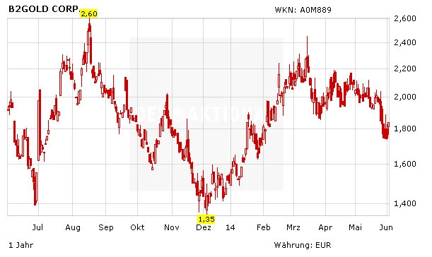 In Ausgabe 23/14 des AKTIONÄRs haben wir Ihnen Papillon Resources als heißen Übernahmekandidat ans Herz gelegt. Schon wenige Tage später war es dann soweit: Die Aktie wurde vom Handel ausgesetzt. Ab morgen dürften die Aktien wieder gehandelt werden – mit einem deutlichen Aufschlag. B2Gold bietet 1,72 Australische Dollar pro Aktie. Umgerechnet entspricht dies einem Kurs von knapp 1,20 Euro.