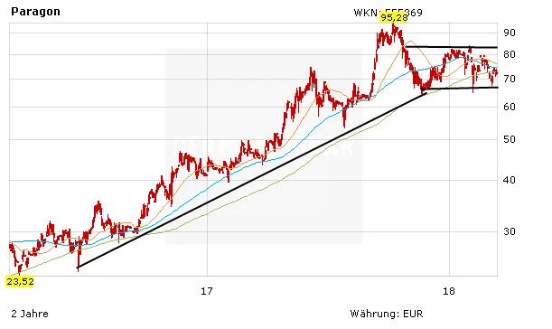 Fazit: Die letzte Korrektur führte die Aktie von Paragon bis knapp unter die wichtige 200-Tage-Linie. Diese wurde aber bereits wieder nach oben durchbrochen. Ein Kaufsignal ergibt sich, sobald das Papier die 90-Tage-Linie bei knapp 74,92 Euro knackt. Das Produktportfolio ist spannend und wer Vorstand Klaus Dieter Frers kennt, der weiß, dass er mit Paragon noch große Ziele hat.