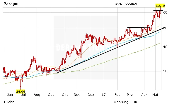 Was das für die Muttergesellschaft bedeuten könnte, hat das Beispiel MBB gezeigt. Die Paragon-Aktie ist zuletzt sogar über die Marke von 60 Euro geklettert. Das Kursziel bleibt 65 Euro plus X.