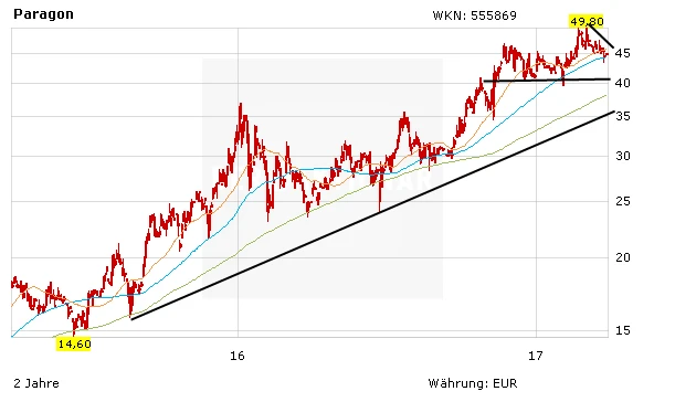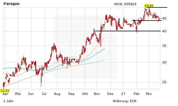 Die Aktie von Paragon konsolidiert seit Wochen auf hohem Niveau. Anleger bleiben investiert. Ein neues Kaufsignal ergibt sich erst wieder, wenn das Papier das Allzeithoch bei 49,50 Euro hinter sich lässt. Wer Vorstand Klaus Dieter Frers kennt, der weiß, dass der ehrgeizige Vorstand sicherlich schon wieder an den nächsten Deals für seine innovative Tochterfirma Voltabox arbeitet.