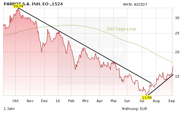 Seit dem Rekordhoch bei über 40 Euro Mitte 2015 befand sich der Drohnen-Spezialist im Abwärtstrend, der mit dem heutigen Kaufsignal endgültig verlassen werden konnte. Parrot bleibt neben GoPro aussichtsreich im Drohnen-Markt positioniert. Die neue Drohne „Disco“ könnte der neue Verkaufsschlager der Franzosen werden. In der Ausgabe 33/16 von DER AKTIONÄR wurde Parrot bereits zum Kauf empfohlen und bleibt vielvesprechend.