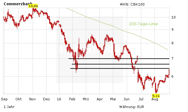 Egal was letztlich passiert: Die Aktie der Commerzbank profitiert deutlich von den Fusionsgerüchten und schraubt sich Richtung 6,40 Euro. Hier liegt ein horizontaler Widerstand. Wird er geknackt läuft der Kurs schon auf die Widerstandsmarken bei 6,50 Euro und 7,00 Euro zu. Fundamental überzeugt die Commerzbank-Aktie mit einem Kurs-Buchwert-Verhältnis von niedrigen 0,3. Investierte Anleger bleiben an Bord, Trader spekulieren auf eine Fortsetzung der Rallye bis 7,00 Euro.