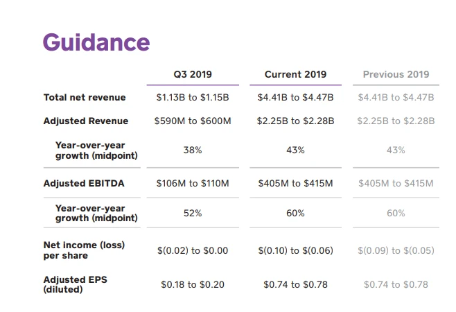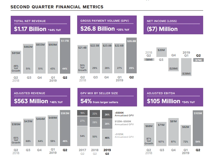Das Transaktionsvolumen (GPV) ist im Vergleich zum zweiten Quartal 2018 um ein Viertel auf 26,8 Milliarden Dollar gestiegen. Großer Händler mit jährlichen Transaktionsvolumen von über 125.000 Dollar machen dabei inzwischen einen Anteil von 54 Prozent aus. Analysten hatte sich beim GPV im Vorfeld 0,1 Milliarden Dollar mehr erwartet.