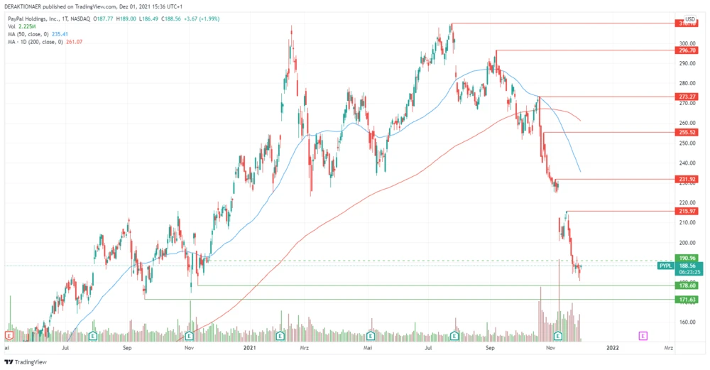 Nachdem auch die Q3-Zahlen enttäuscht haben, beschleunigte sich der Absturz bei der Paypal-Aktie. Die Kursverluste summieren sich seit dem Allzeithoch bei 310 Dollar im Sommer auf rund 40 Prozent. Aktuell pendelt die Aktie seit einigen Tagen bei rund 190 Dollar und der Abverkauf verlangsamte sich.