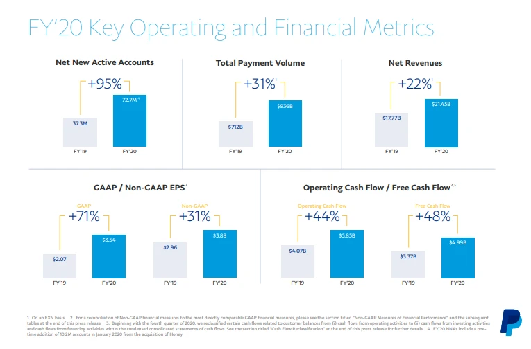 72,7 Millionen neue Nutzer, fast eine Billion Dollar Transaktionsvolumen, 71 Prozent mehr Gewinn: Für Paypal war das abgelaufene Geschäftsjahr ein voller Erfolg und von zahlreichen Rekorden geprägt. Das Unternehmen hat am Mittwochabend einen Jahresumsatz von 21,5 Milliarden Dollar und einen Gewinn pro Aktie von 3,54 Dollar gemeldet. Im Vergleich zum Vorjahr entspricht das Zuwächsen von 21 Prozent beziehungsweise 71 Prozent.