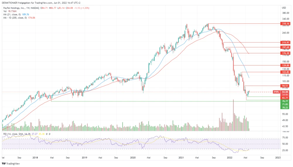 Die Paypal-Aktie hat schwere Monate hinter sich und es kann noch keine Entwarnung gegeben werden. Wichtig ist jetzt, dass die beiden Unterstützungen halten, da ansonsten eine weitere starke Verkaufswelle droht. Anleger halten daher vorerst die Füße still und warten, bis sich ein klares Zeichen der Entspannung abzeichnet.