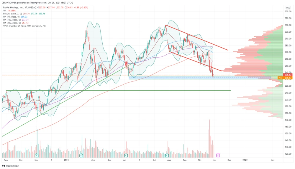 Auch schon vor den Spekulationen über den Pinterest-Kauf geriet die Paypal-Aktie unter Druck. Nachdem sie am 26. Juli ein Rekordhoch bei 310,16 Dollar markiert hatte, konsolidierte sie innerhalb eines abfallenden Kanals. Zuletzt schwankte der Kurs dabei um die 200-Tage-Linie bei rund 266 Dollar. Nach dem Aufkommen der Gerüchte fiel er jedoch sowohl unter diese Linie, als auch unter die Kanalbegrenzung bei 249 Dollar. Aus charttechnischer Sicht sind das starke Verkaufssignale, die selbst das Dementi der Übernahmegerüchte überschatteten. Nach einem kurzen Erholungsversuch am Montag ging der Wert folglich erneut auf Talfahrt.
