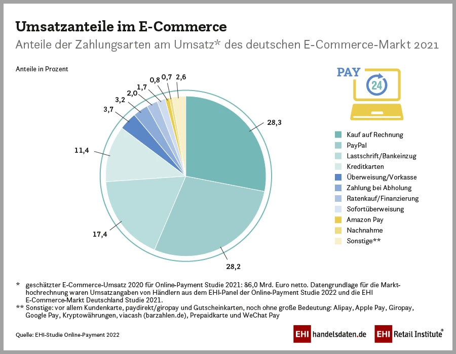 Der Online-Bezahldienst konnte seinen Marktanteil im Jahr 2021 von 24,9 auf 28,2 Prozent steigern und ist damit drauf und dran, den Rechnungskauf als Online-Bezahl-Favoriten der Deutschen zu überholen. Denn dieser hat im Vergleich zum Vorjahr rund 2,1 Prozentpunkte verloren.