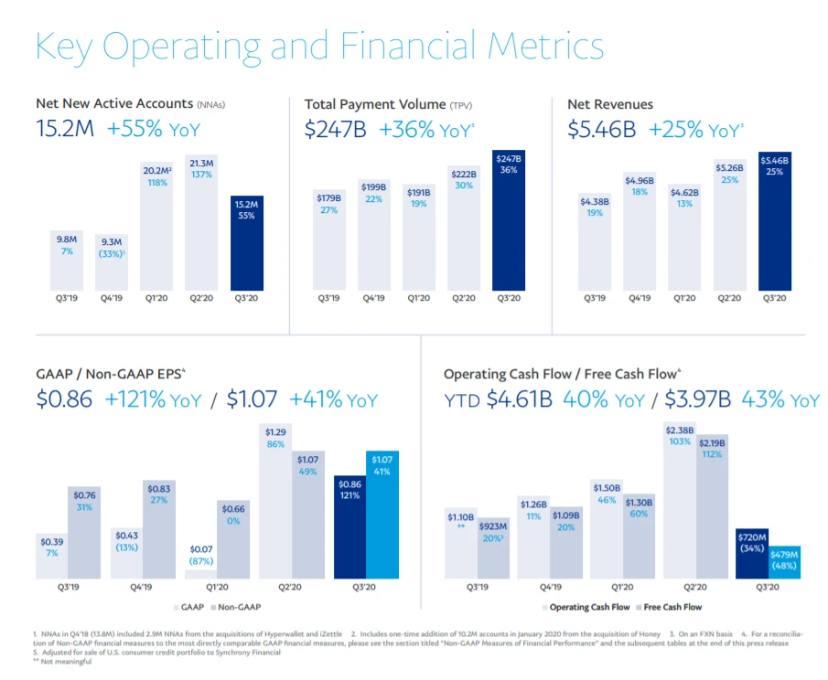 Digitale Bezahllösungen boomen und haben bei Paypal auch im dritten Quartal für kräftiges Wachstum gesorgt: Das Transaktionsvolumen ist im Jahresvergleich um 36 Prozent auf 247 Milliarden Dollar gestiegen und hat dem Unternehmen ein Umsatzplus von 25 Prozent auf rund 5,5 Milliarden Dollar beschert. Der Gewinn pro Aktie hat sich mit 0,86 Dollar sogar mehr als verdoppelt. Die Umsatz- und Ergebniserwartungen der Wall Street wurden damit übertroffen.