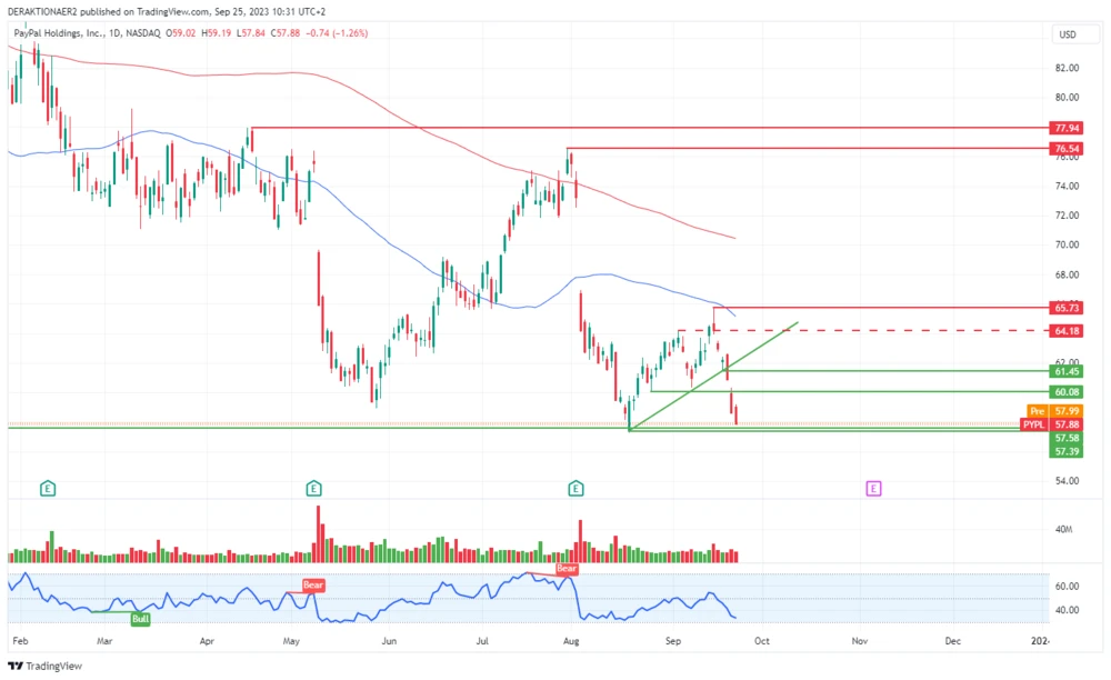 Der Chart der PayPal-Aktie ist stark angeschlagen, weitere Verluste drohen, sollte der Titel unter das Jahrestief fallen. Anleger beachten den Stopp bei 50,00 Euro.