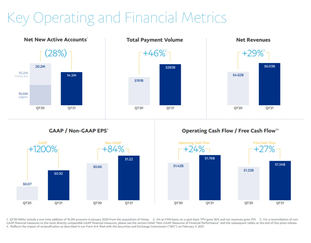 Kräftige Anstiege bei der Zahl der aktiven Nutzer (+21 Prozent) und des Transaktionsvolumens (+50 Prozent) haben dem Online-Bezahldienst das „stärkste erste Quartal“ in der Unternehmensgeschichte beschert. Im Vergleich zum Vorjahreszeitraum ist der Umsatz um 29 Prozent auf 6,03 Milliarden Dollar gestiegen. Der bereinigte Gewinn pro Aktie stieg sogar um 84 Prozent auf 1,22 Dollar. Analysten hatten mit Erlösen von 5,88 Milliarden Dollar und einem EPS von 1,01 Dollar im Schnitt weniger erwartet.