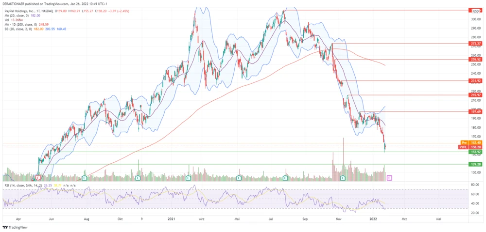 Die technische Lage bei der Paypal-Aktie ist düster. Zugleich signalisieren der RSI-Indikator und auch die Bollinger-Bänder seit einigen Tagen eine starke Überreaktion nach unten. Allerdings veröffentlicht heute Abend ab 20 Uhr MEZ auch die Fed ihr neustes Protokoll, was für weiteren Sprengstoff an den Märkten sorgen kann. Kurzum: Die Volatilität bleibt hoch und die weitere Entwicklung ist schwer einzuschätzen. Anleger sollten aktuell jedoch nicht ins fallende Messer greifen und den Stoppkurs bei 130 Euro beachten.