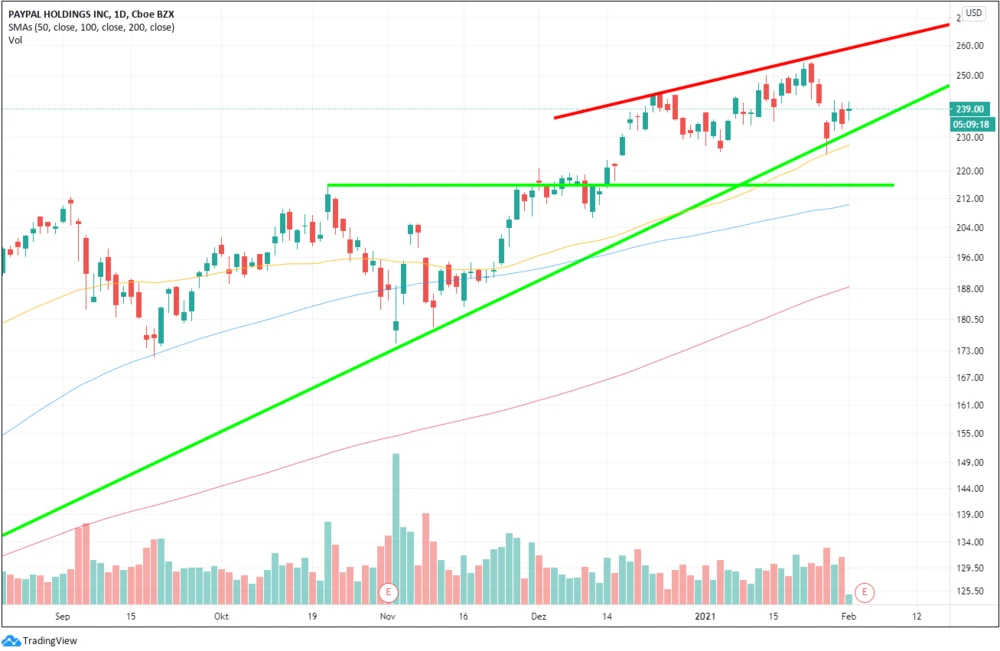 Bereits seit März bewegt sich die Paypal-Aktie in einem steilen Aufwärtstrend nach oben und markiert ein Rekordhoch nach dem anderen. Nach dem jüngsten Allzeithoch am 25. Januar bei 254,39 Dollar korrigierte der stark überhitzte Wert jedoch und setzte dabei innerhalb von zwei Handelstagen bis an die 50-Tage-Linie bei 225 Dollar zurück, die im Moment parallel zur Trendlinie verläuft.