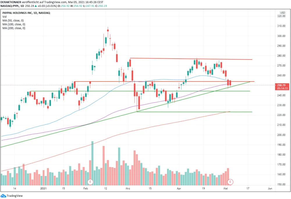 Der seit Monaten anhaltende Aufwärtstrend der Paypal-Aktie ist Mitte Februar ins Stocken geraten. Nach einem knapp 30-prozentigen Rücksetzer bis auf das 2021er-Tief bei 223,09 Dollar schwankte der Kurs um die 100-Tage-Linie, die parallel zur langfristigen Aufwärtstrendlinie verläuft und gerade bei 251,91 Dollar steht.