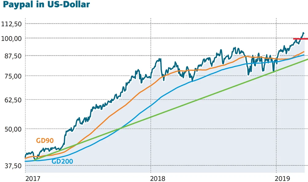 Die Paypal-Aktie steigt und steigt und steigt. Am Donnerstag kletterte der Titel des amerikanischen Vorzeige-Fintechs auf 104 Dollar – und markierte damit ein neues Rekordhoch.