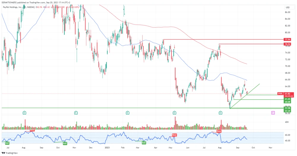 Die PayPal-Aktie hat eine starke Vorwoche hinter sich. Wichtig war für die Bullen der Ausbruch am vergangenen Donnerstag. Mit dem Sprung über den Widerstand bei 63,77 Dollar wurde ein frisches technische Kaufsignal ausgelöst. Am Freitag setzt sich der freundliche Trend zunächst fort und die Bullen stehen kurz davor, den GD50 bei aktuell rund 66,00 Dollar zu erreichen.